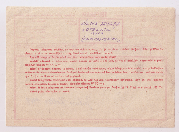 From 1969, Július Koller became interested in punctuation, which are reduced to their conceptual essence as in Question Mark Telegram. The most common is the question mark that is closest to the situation of a UFO-naut in an unknown environment: “I have so many question marks, so many unsatisfied curiosity, a question mark itself symbolizes all question marks ”. The question becomes the symbol of the identity of the author. “I specialize in all hesitation, questioning, in questions. I started to specialize in hesitation, until I became a question mark for myself”.