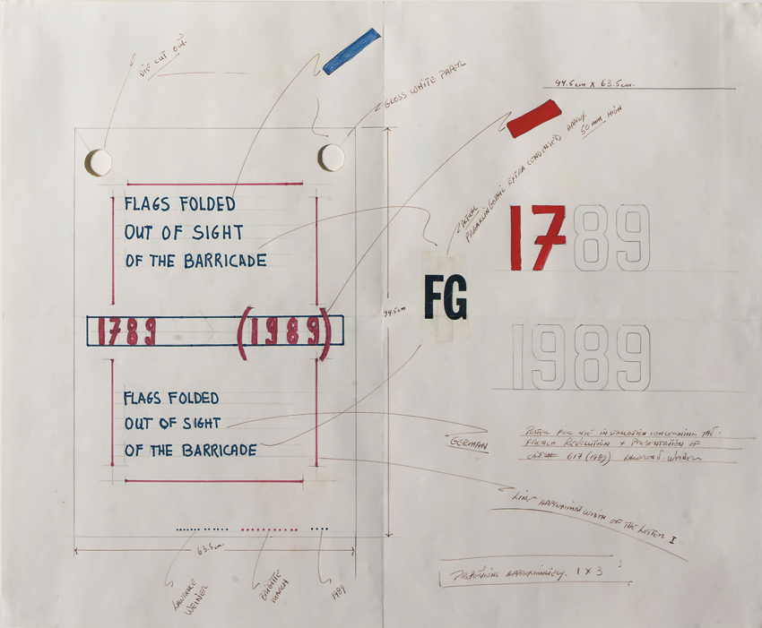 Lawrence Weiner, einer der wichtigsten Vertreter der Konzeptkunst, untersucht seit den späten Sechzigerjahren, inwieweit sich Sprache als skulpturales Medium und primärer Träger künstlerischer Arbeit einsetzen lässt. Im Jahr 1968 schrieb Weiner sein grundlegendes „Statement of Intent“: „(1) Der Künstler kann das Werk herstellen. (2) Das Werk kann angefertigt werden. (3) Das Werk braucht nicht ausgeführt zu werden. [Jede Möglichkeit ist gleichwertig und entspricht der Absicht des Künstlers, die Entscheidung über die Ausführung liegt beim Empfänger zum Zeitpunkt des Empfangs.]“ Er vertritt damit die Auffassung, dass ein Kunstwerk keine formale Umsetzung benötigt, solange es durch Sprache definiert wird. Dieser Ansatz hat zu einer radikalen Neudefinition des Verhältnisses von Künstler, Kunstwerk und Betrachter geführt. Zwar entstehen seit den Siebzigerjahren auch Bücher, Filme, Videos, Performances und Audioaufnahmen, doch hauptsächlich äußert sich Weiner durch Textarbeiten, die direkt auf die Wandfläche aufgetragen werden: Statements, die selbstbezügliche Aussagen, praktische Vorschläge oder Handlungsanweisungen formulieren. Mittels Form, Farbe, Zeichensetzung und Gestaltung der Buchstaben erforscht Weiner das Zusammenspiel von Werk, Präsentationskontext und räumlichen Gegebenheiten, die ihrerseits die Lesart der Spracharbeiten beeinflussen. Manche Werke basieren auf Gedichten, Slogans oder dekontextualisierten Gesprächsfetzen, andere wiederum enthalten sehr direkte kulturelle und historische Bezüge, so Flags Folded Out of Sight of the Barricade 1789, der Entwurf für eine Textarbeit anlässlich des zweihundertsten Jahrestags der Französischen Revolution.