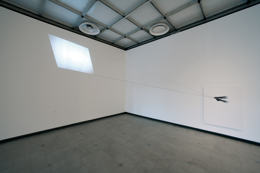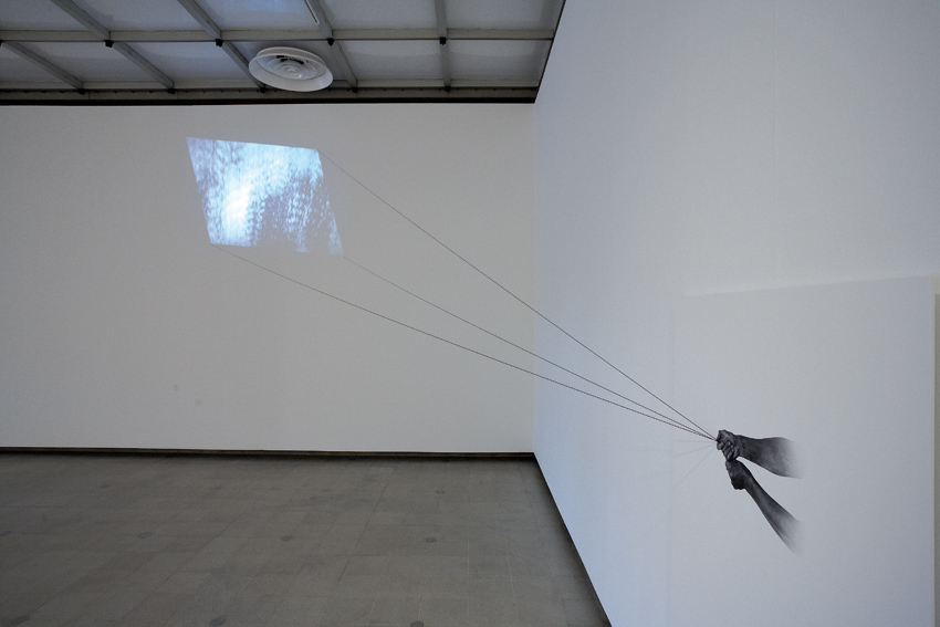 Seit Ende der Neunzigerjahre verbindet Robin Rhode großformatige Kohlezeichnungen mit Performances, die diese Zeichnungen aktiv miteinbeziehen, zumeist auf der Straße stattfinden und sich um alltägliche Handlungen drehen. Die fotografischen Dokumente dieser von ihm „performative Zeichnungen“ genannten Aktionen verarbeitet er später zu Videoanimationen, die mit ihren ruckelnden Einzelbildern an Daumenkinos erinnern. Die Video-Installation Kite (2008) besteht aus einem Druck, der die Hände des Künstlers zeigt, und einer Videoprojektion in Form eines Kinderdrachens an der daneben liegenden Wand: Bilder von Bäumen ziehen vor dem Auge des Betrachters vorbei. Schnüre, die von den Händen zum „Drachen“ reichen, verbinden die einzelnen Elemente des Werks. Diese so zarte, poetische Installation wirkt zunächst wie eine Inszenierung von Kindheitserinnerungen an Drachensteigen und Autofahrten durch sonnige Wälder, doch die Stimmung ändert sich. Wehmut und schmerzliche Gefühle kommen auf, wenn die Geschwindigkeit der Bilder zunimmt, die Bäume verschwimmen und Regen prasselt. Das Video wurde 2008 in New Orleans gedreht und beschwört die unvorhersehbare Tragödie des Hurrikans Katrina herauf.