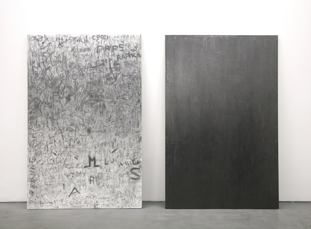 Das Zeichnen ist nicht direktes Produkt einer Handlung, sondern entspringt der Demonstration eines Prozesses – wie eben bei Duochrome (Trace). Die Zeichnungen sind gleichzeitig Produkte und Rückstände der verwendeten Arbeitsmittel (Graphitrückstände, durchgestrichene bunte Linien, geschnittenes Papier …).
