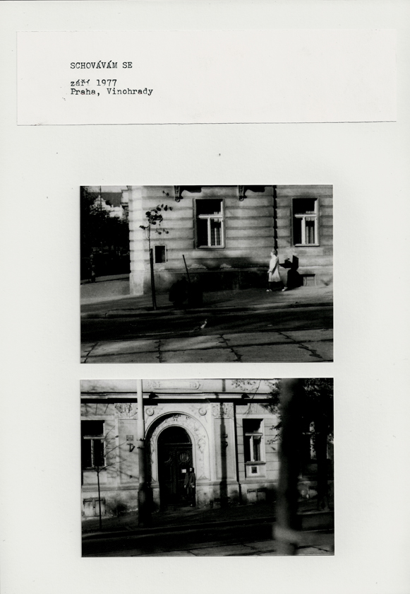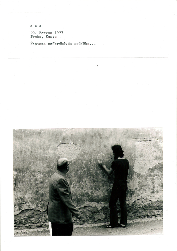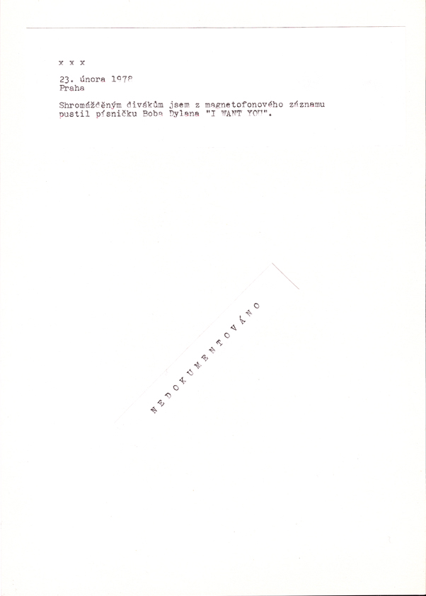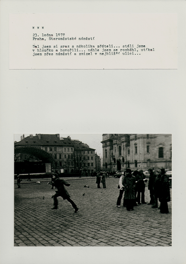 XXX, I Arranged to Meet a Few Friends … We Were Standing in a Small Group on the Square, Talking … Suddenly, I Started Running; I Raced Across the Square and Disappeared into Melantrich Street ... (23. Januar 1978); XXX, Scratching Previously Drawn Hearts Off the Wall With My Nails ... (29. Juni 1977); I Hide (September 1977) und XXX, I Played a Recording of Bob Dylan’s “I Want You” From a Tape Player to a Group of Listeners Gathered Round (23. Februar 1978) sind Teil einer Serie. Es handelt sich um maschinengeschriebene tschechische Texte mit englischem Titel, teilweise mit Fotografien von früheren „diskreten“ Performances Jiří Kovandas im Prag der späten 1979er-Jahre, wie auch aus dem Datum im Titel ersichtlich ist.
