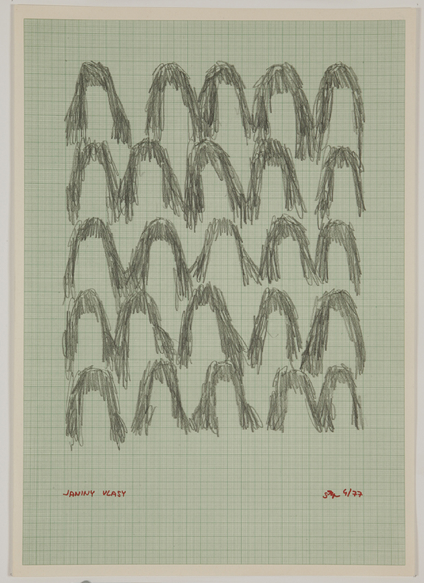 Neben seinen Performances fertigte Kovanda auch Zeichnungen an, etwa die Serien Crossed It Out und Circle von 1977 auf grünem Millimeterpapier. Auch Jana’s Hair, 4/77 zählt zu dieser Serie von Bildern, von denen die meisten kaum bekannt und ebenfalls in den späten 1970er-Jahren entstanden sind.