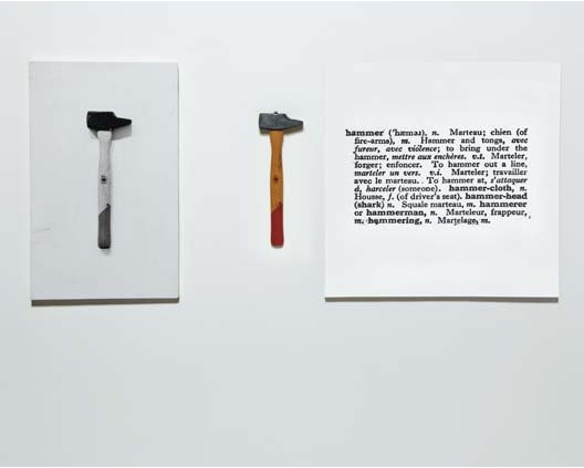 One and three hammers (1965) ist ein Paradebeispiel für Kosuths Verwendung von Worten und Sprache als künstlerisches Mittel. Die Arbeit ist auf maschinengeschriebene Worte reduziert und fungiert so als visueller und verbaler Code, der den Betrachter dazu einlädt, sich mit der dialektischen Beziehung zwischen der Kunstidee und dem verwirklichten Objekt auseinanderzusetzen. Kosuths eigene Auseinandersetzung mit Sprache, Bedeutung, Bezug und der Deutung von visueller Information ist im Grunde eine Untersuchung des Wesens von Kunst an sich.