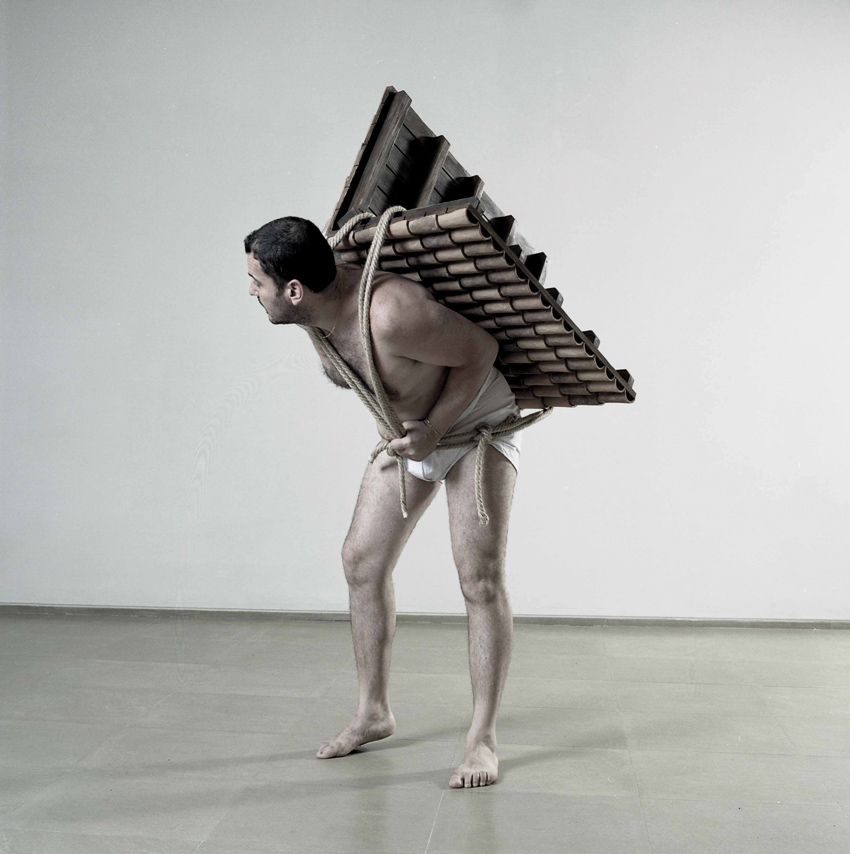 Auf der Home To Go betitelten Fotografie müht sich der halbnackte Künstler sichtlich, ein auf den Rücken geschnalltes Ziegeldach zu tragen. Es gibt diese Arbeit auch als Skulptur, als Guss aus Marmormehl und Harz. Paci konfrontiert hier die formalen Charakteristika des sozialistischen Realismus mit einem Problem von großer gesellschaftlicher Tragweite, nämlich der Immigration. Das Dach als Teil eines Hauses repräsentiert die Erinnerung an eine Geschichte, Kultur, Tradition und Familie, die der Künstler überallhin mit sich trägt: Bindung und Last zugleich.