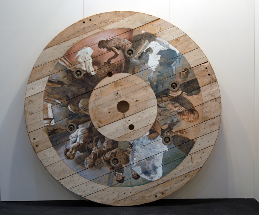 Wedding gehört zu einer Gemäldeserie mit intimen Szenen, Familienbildern und Interieurs aus ganz unterschiedlichen Quellen, von der persönlichen Geschichte des Künstlers bis hin zu Szenen aus Pasolini-Filmen. Die Motive sind in der Manier des sozialistischen Realismus auf ein hölzernes Rad gemalt, das an das traditionelle Format des Tondos, des Rundbilds in der Renaissance, erinnert.