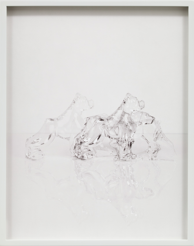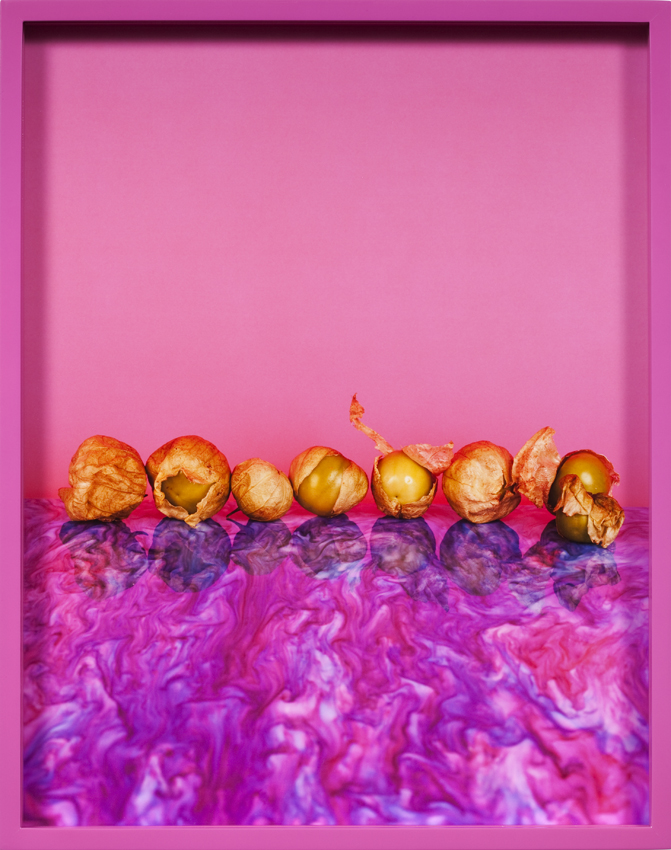 In the highly staged images that he himself shoots, Lassry usually photographs fruit and vegetable, cosmetics, fashion and design objects, animal or human models, featured in elaborate but deliberately purposeless compositions, which interrogate photographic aesthetics and conventions. The subjects of the pictures are always treated in their most precise formal details, while the use of monochrome backgrounds from the dominant colour of the photograph itself exclude any narratives and isolate the image. The frames are also painted in the same colour, which adds to the sculptural impact of these objects. Some images are balanced between stillness and movement by resorting to the early photographic strategy of multiple exposures, allowing doubling, ghosted images or a blur. Lassry’s images, devoid of symbolic pregnancy, authorship and intentionality, tend to question the act of seeing itself.