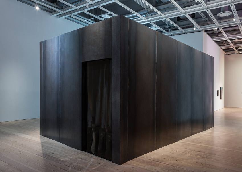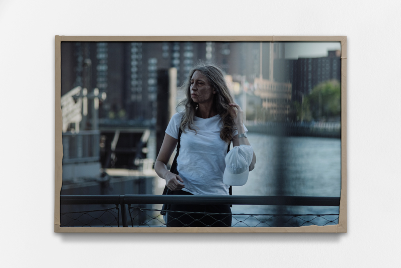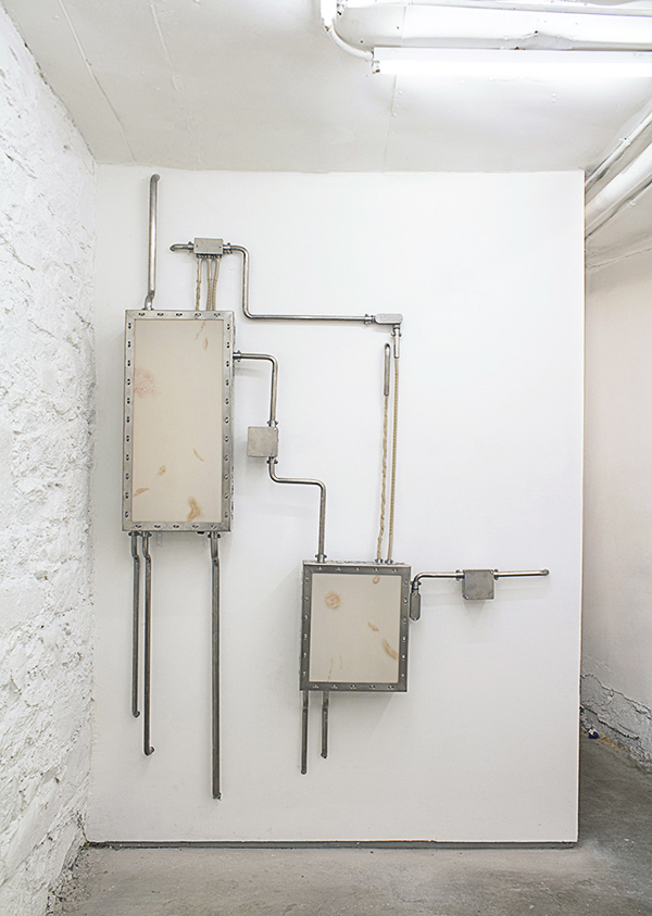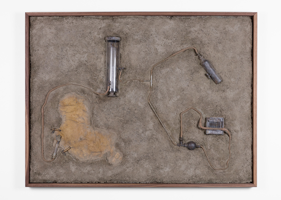 Laboratory glassware, cast silicone tubing, surgical latex tubing, acrylic and metal attachments, polystyrene foam, aqua resin, fiberglass strand, rocks, soil, sand, cement, acrylic polymer with pigment suspension, aluminum armature, latex screen-used zombie prosthetic skin from ‘Underworld: Evolution’ (2006), stained walnut frame
