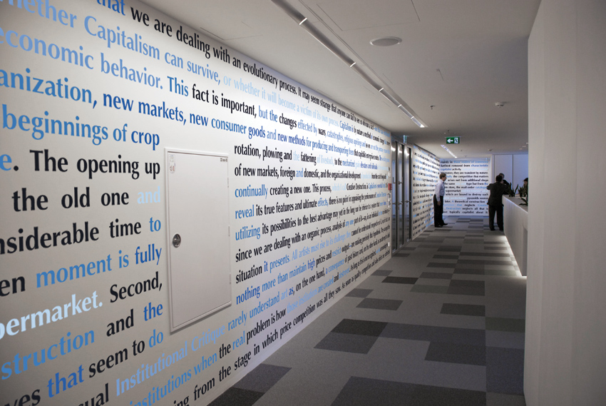 In Creative Destruction In Action, parts of the famous book written by the Austrian born economist J. A. Schumpeter (1883–1950) Capitalism, Socialism and Democracy, first published in 1942, are displayed as a space-filling wall piece. Schumpeter’s most widely known idea is “Creative Destruction”: it addresses how, in economic life, old ways of doing business are destroyed in the process of new methods coming to life. Scanlan applies this theory of the essence of capitalism to art by changing, rewriting and rearranging Schumpeter’s text and by inserting words and sentences. Through Scanlan’s revisions – recognizable thanks to the artist’s use of different shades of blue – Schumpeter’s text itself becomes the subject of a creative destruction process. Scanlan keeps the dynamics of creative destruction alive by incessantly discovering new production, display, and distribution-niches for his art.